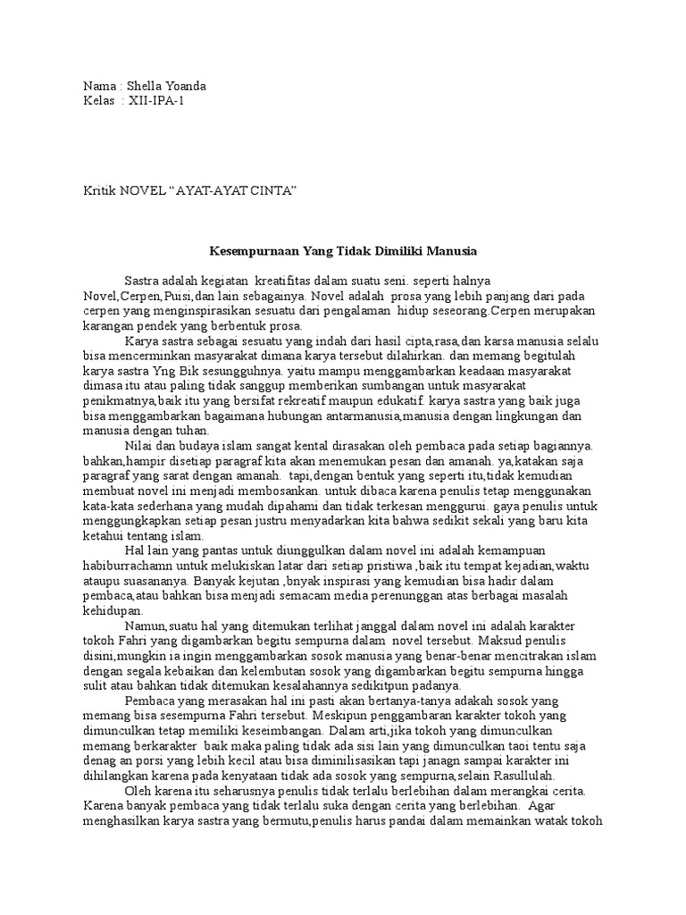 Contoh kritik dan esai novel. 1Walupun terdapat beberapa kritik yang tidak mendukung novel inimenurut saya novel ini mempunyai tema yang bagus memuat tentang pendidikanSelain itu novel ini dapat membangkitkan kita agar tidak mudah putus asa jika ingin meraih mimpi. Selamat datang di PakDosencoid web digital berbagi ilmu pengetahuan. Kata novel berasal dari bahasa Italia novella yang berarti sebuah kisah sepotong berita.
