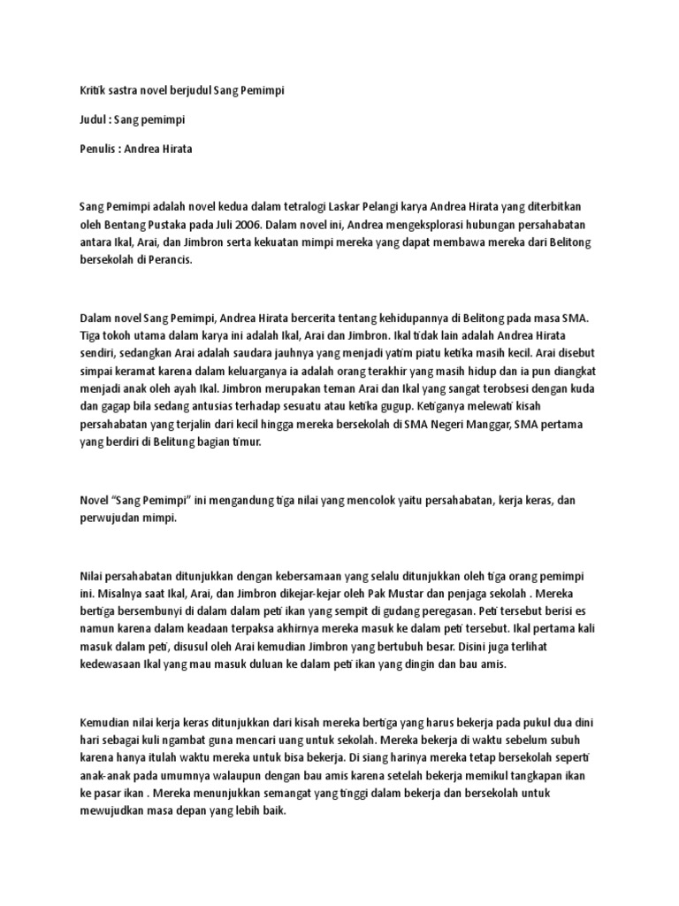 Kisah ini juga dilengkapi dengan nilai-nilai kehidupan yang penuh cinta dan perjuangan. Novel yang akan saya kritik disini yaitu novel yang berjudul Laskar Pelangi karya Andrea Hirata. Anda bisa mendownload atau mencetak gambar atau foto contoh esai novel laskar pelangi di bawah ini menggunakan.
