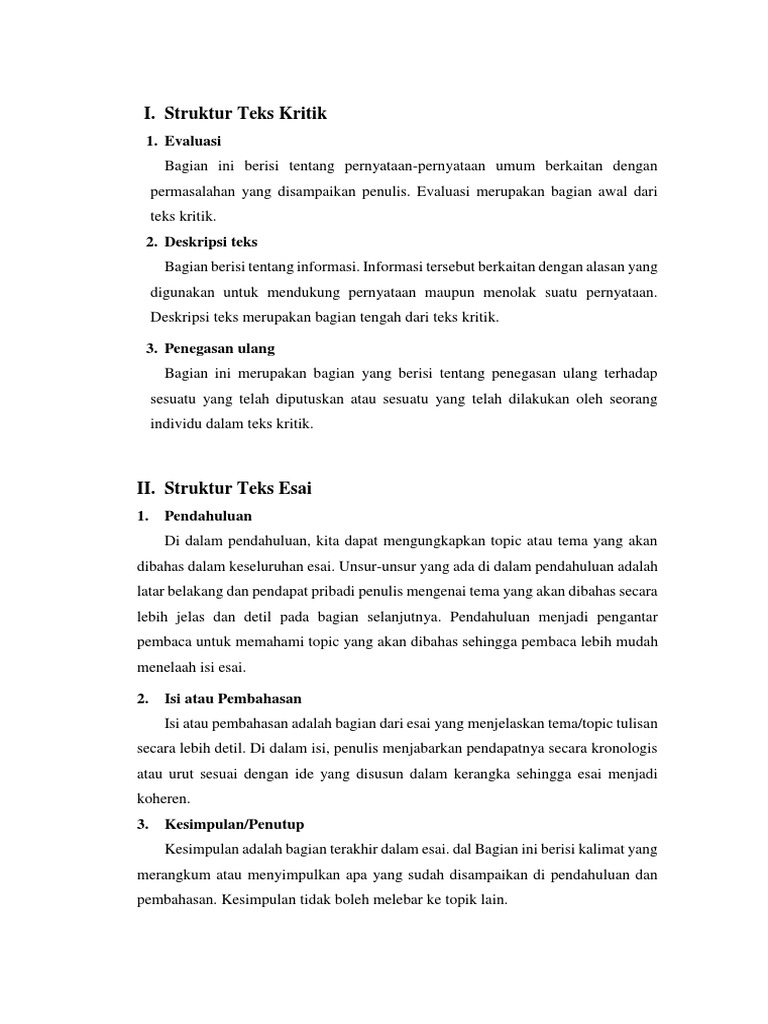 Tampaknya kebijakan tersebut memang berniat untuk mensejahterakan rakyat hanya saja fakta lapangan berkata lain. Berikan Contoh Kritik Sastra dan Esai Lengkap - Pengertian Esai adalah karangan prosa yang membahas suatu masalah secara sepintas lalu dari sudut pandang pribadi penulisnya. Pada umumnya di dalam sebuah novel memuat tentang problem kehidupan masyarakat yang digambarkan oleh pengarang melalui tokoh dan.