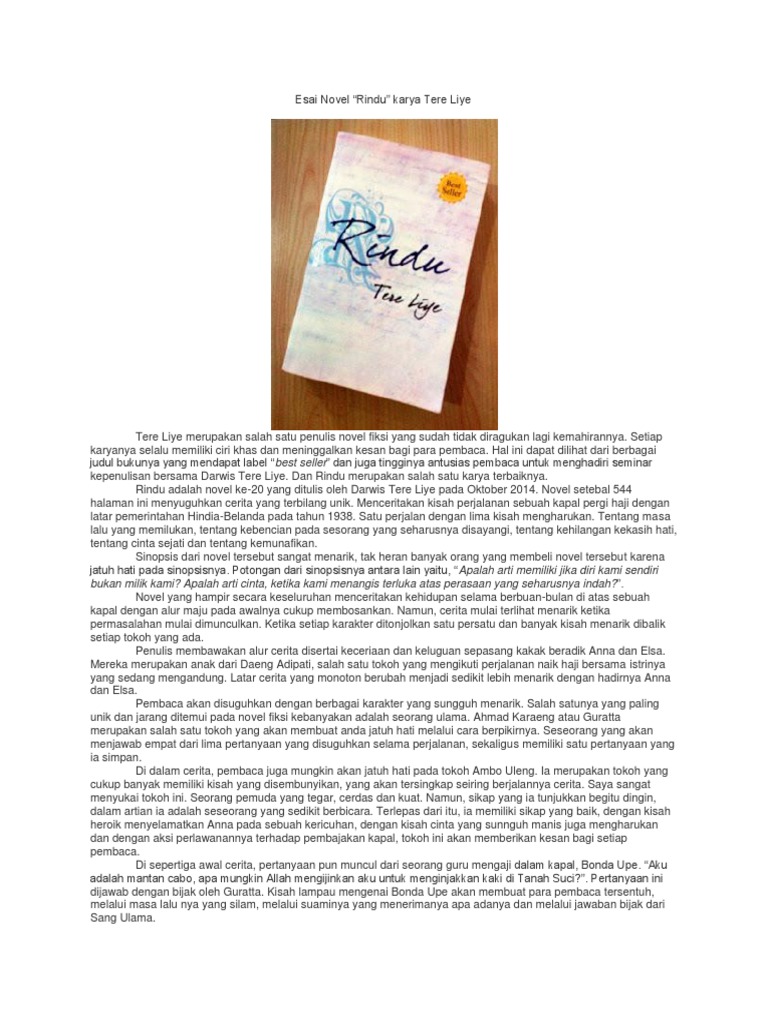 Pengarang esai disebut esai. Novel adalah bentuk sastra yang paling popular di dunia. Berikut merupakan contoh esai mengenai novel Rindu.